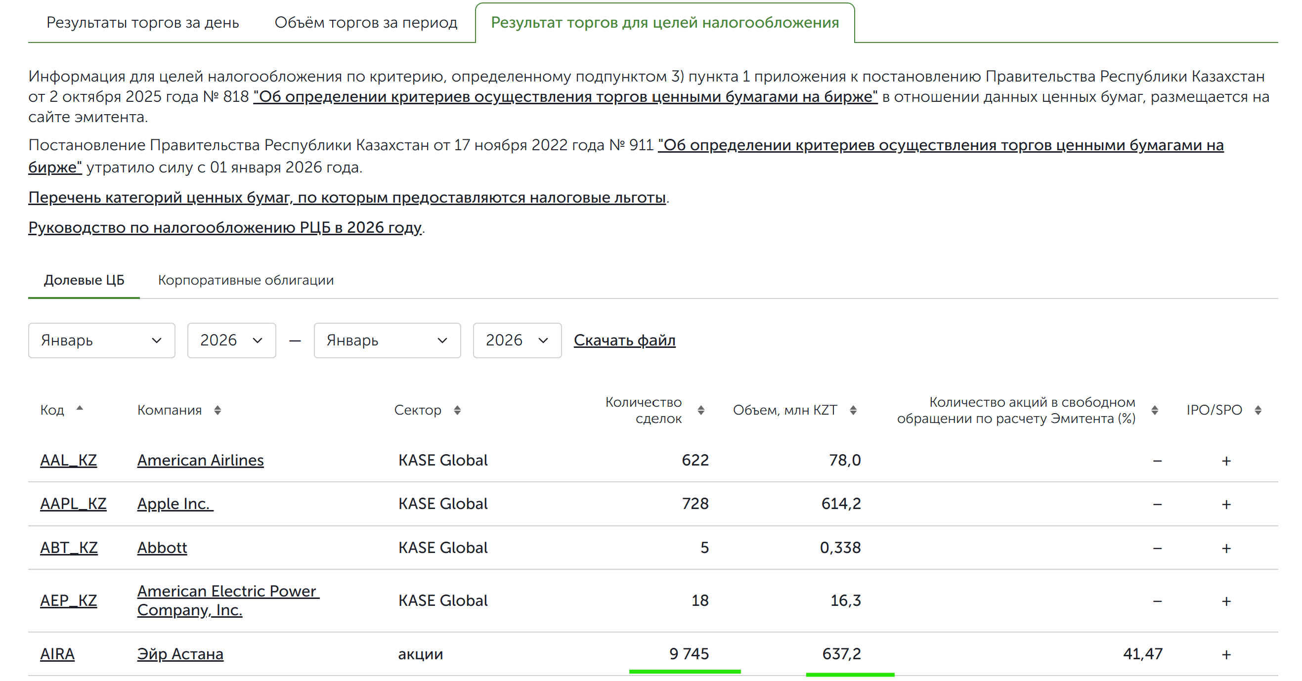 В январе количество сделок составило 193, объем торгов — 142,6 млн тенге (критерии выполнены).