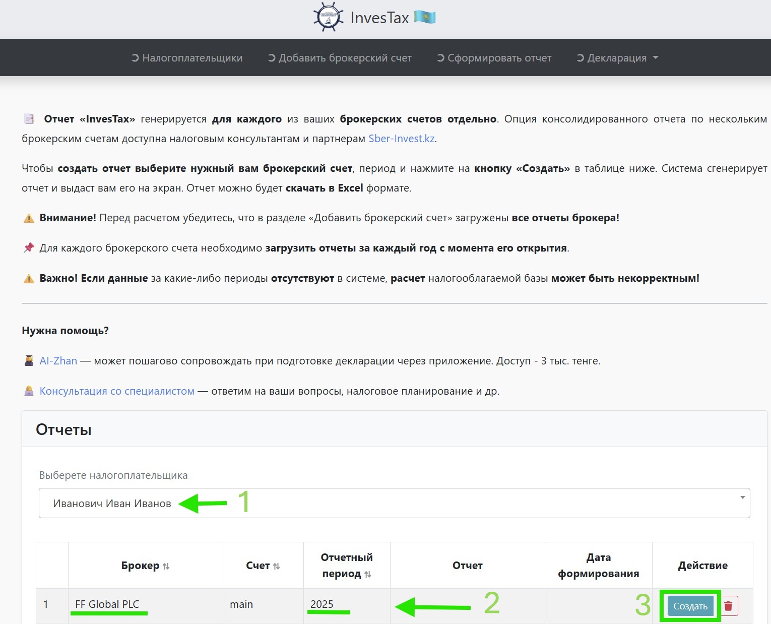 Перейдите во вкладку «Сформировать отчёт», выберите налогоплательщика, брокера, отчётный период и нажмите «Создать».