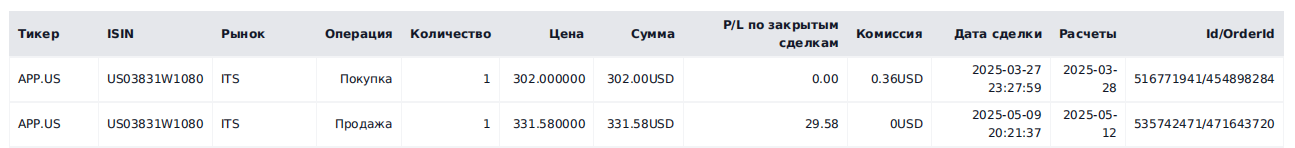Таблица 2. Отчёт брокера по совершенным сделкам в 2025 году.