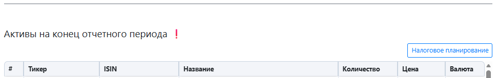Если доход от прироста стоимости есть можно переходить к оптимизации. Прокрутите страницу расчёта вниз до блока «Активы на конец периода» и нажмите кнопку «Налоговое планирование».