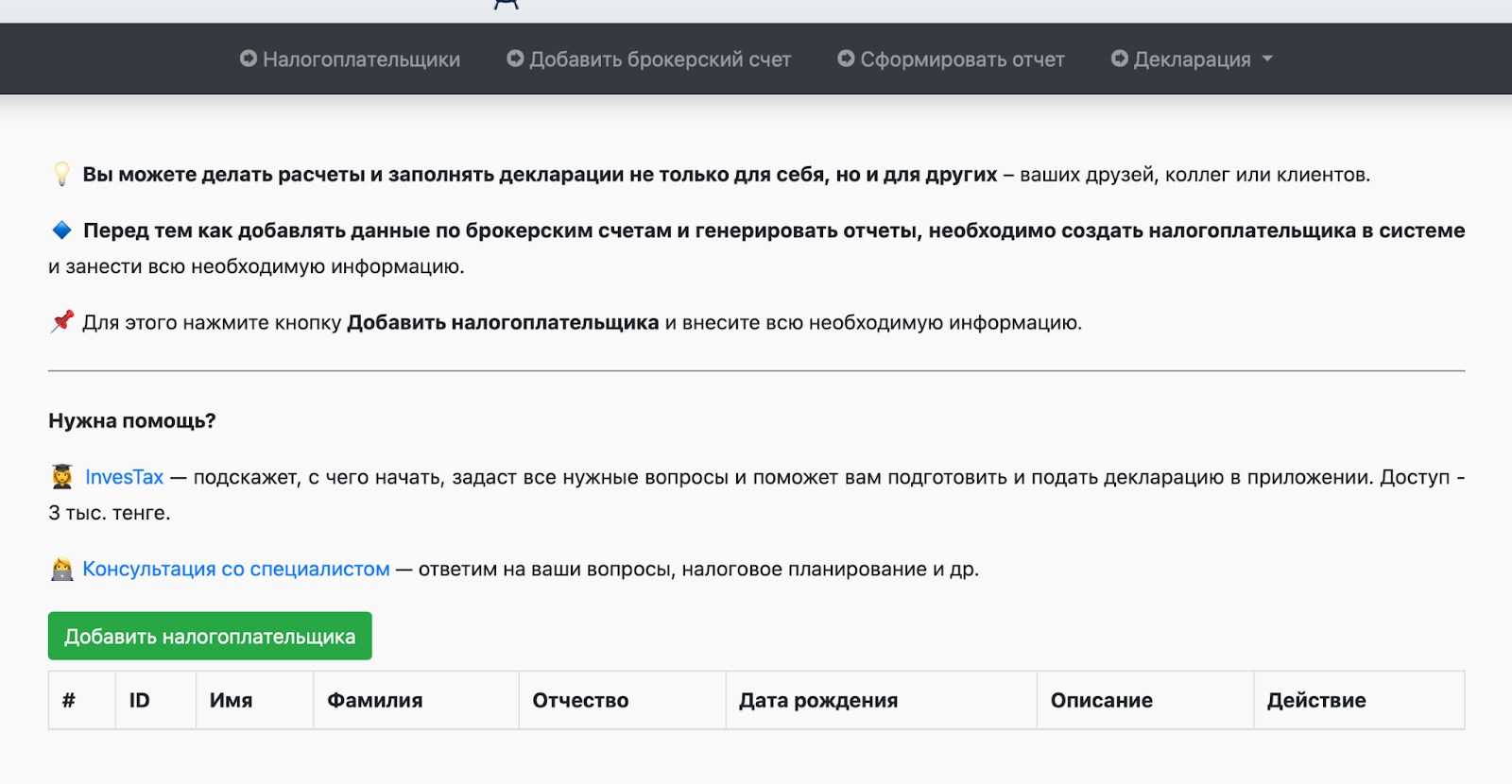 Для примера создадим профиль условного инвестора Армана. Он, как и многие пользователи InvesTax, хочет заранее рассчитать налог и понять, можно ли его уменьшить.
