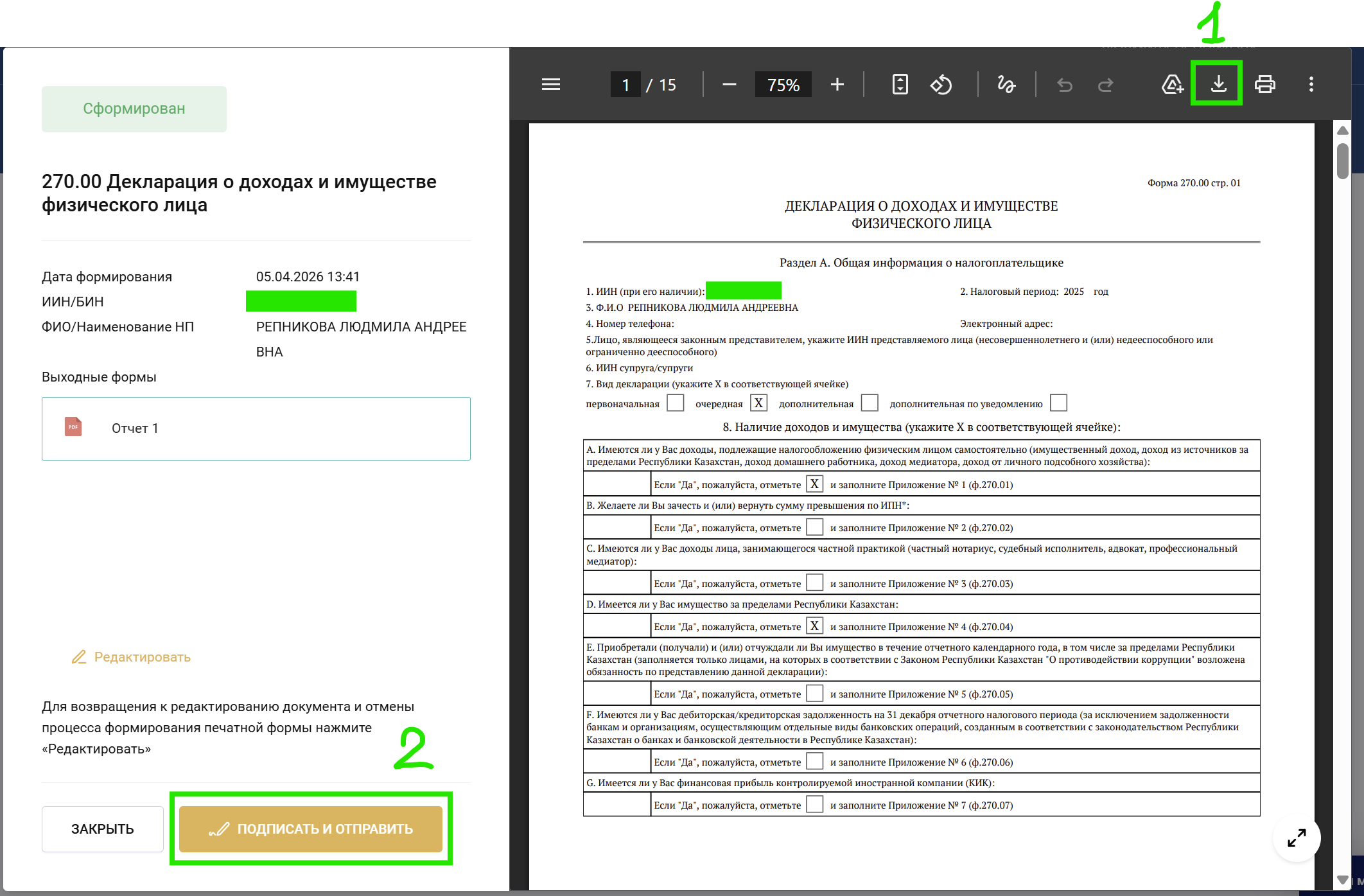 Скачайте декларацию в формате PDF к себе на компьютер (Шаг 1), еще раз перепроверьте все данные, а затем нажмите “Подписать и отправить” и подпишите вашим ЭЦП ключом (Шаг 2).