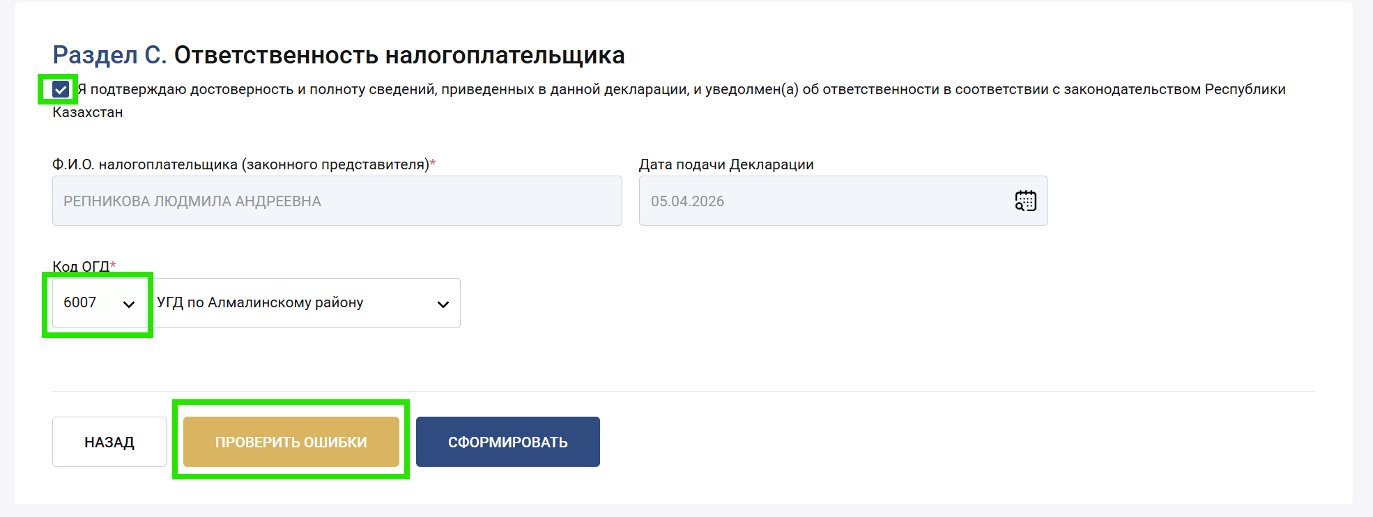 1. Необходимо подтвердить (поставить галочку) достоверность и полноту сведений в декларации и проверить код органа государственных доходов
