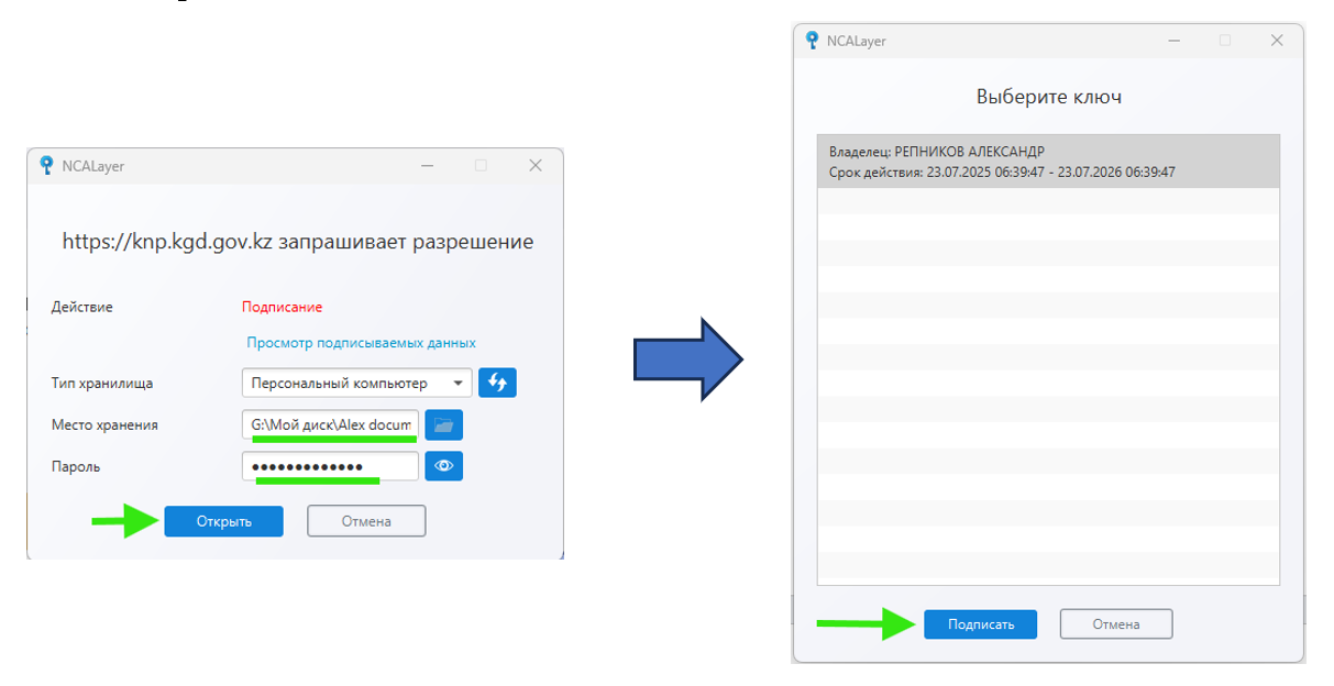 - → выберите путь к вашему файлу ЭЦП (Қойма түрі),