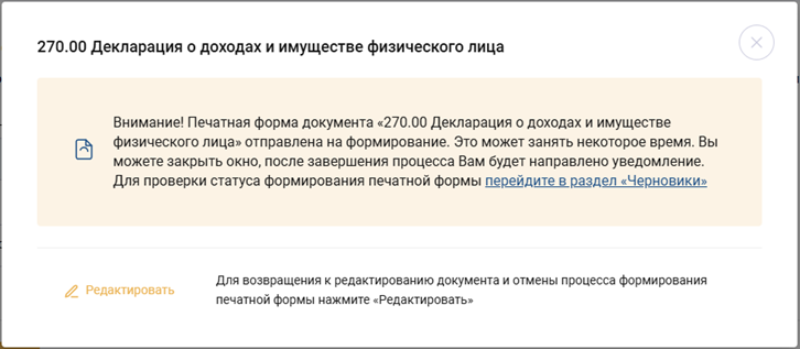 Формирование документа может занять некоторое время. Обычно - несколько секунд, но зависит нагрузки и в пиковые часы / дни может занимать больше (например, в августе и сентябре). Система предупредит об этом - сообщение ниже.