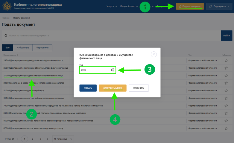 В правом верхнем углу нажимаем на кнопку «Подать документ», в вписке находим нужную форму («270.00 Декларация о доходах и имуществе физического лица» или «250.00 Декларация об активах и обязательствах физического лица») и выбираем нужный отчетный периода (год) для заполнения.