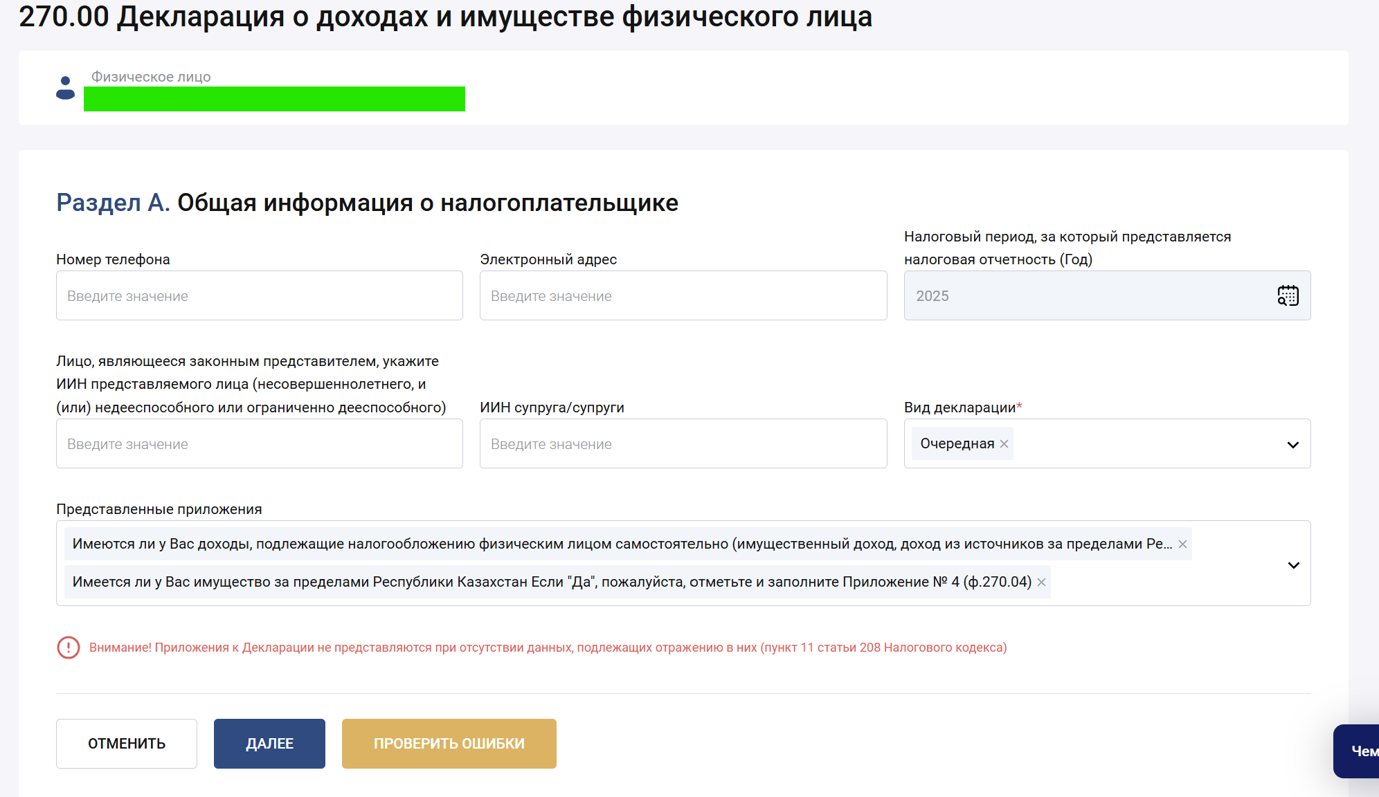 → Имеются ли у Вас доходы, подлежащие налогообложению физическим лицом самостоятельно (имущественный доход, доход из источников за пределами Республики Казахстан, доход домашнего работника, доход медиатора, доход от личного подсобного хозяйства);