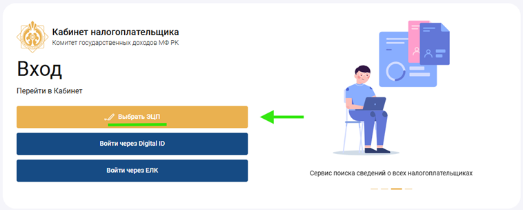 Перейдите по ссылке 👉 https://knp.kgd.gov.kz/signin и нажмите кнопку «Выбрать ЭЦП».